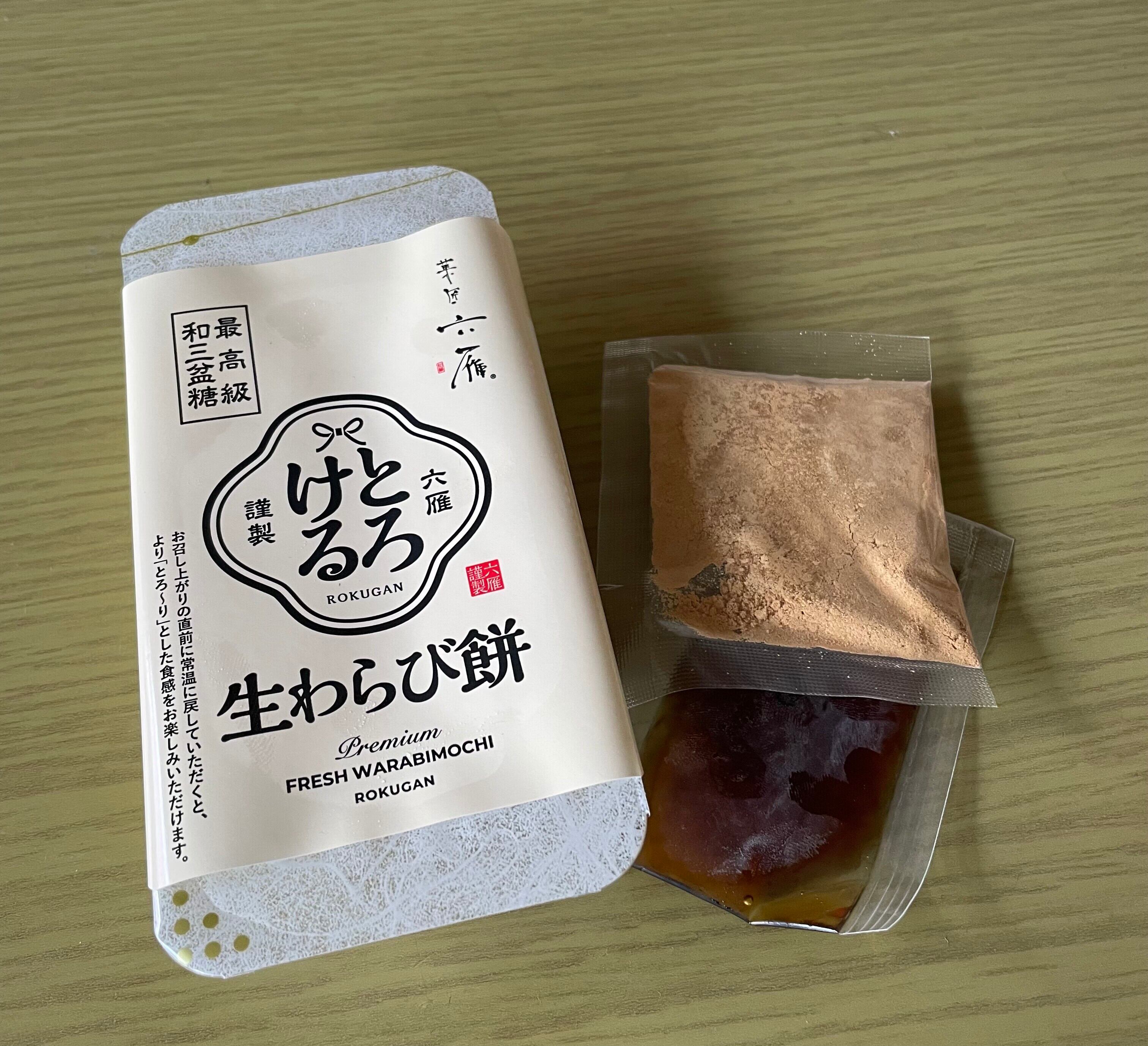 個包装わらび餅6つ(約360g)に、きなこと黒蜜6袋ずつを同梱した商品となります。